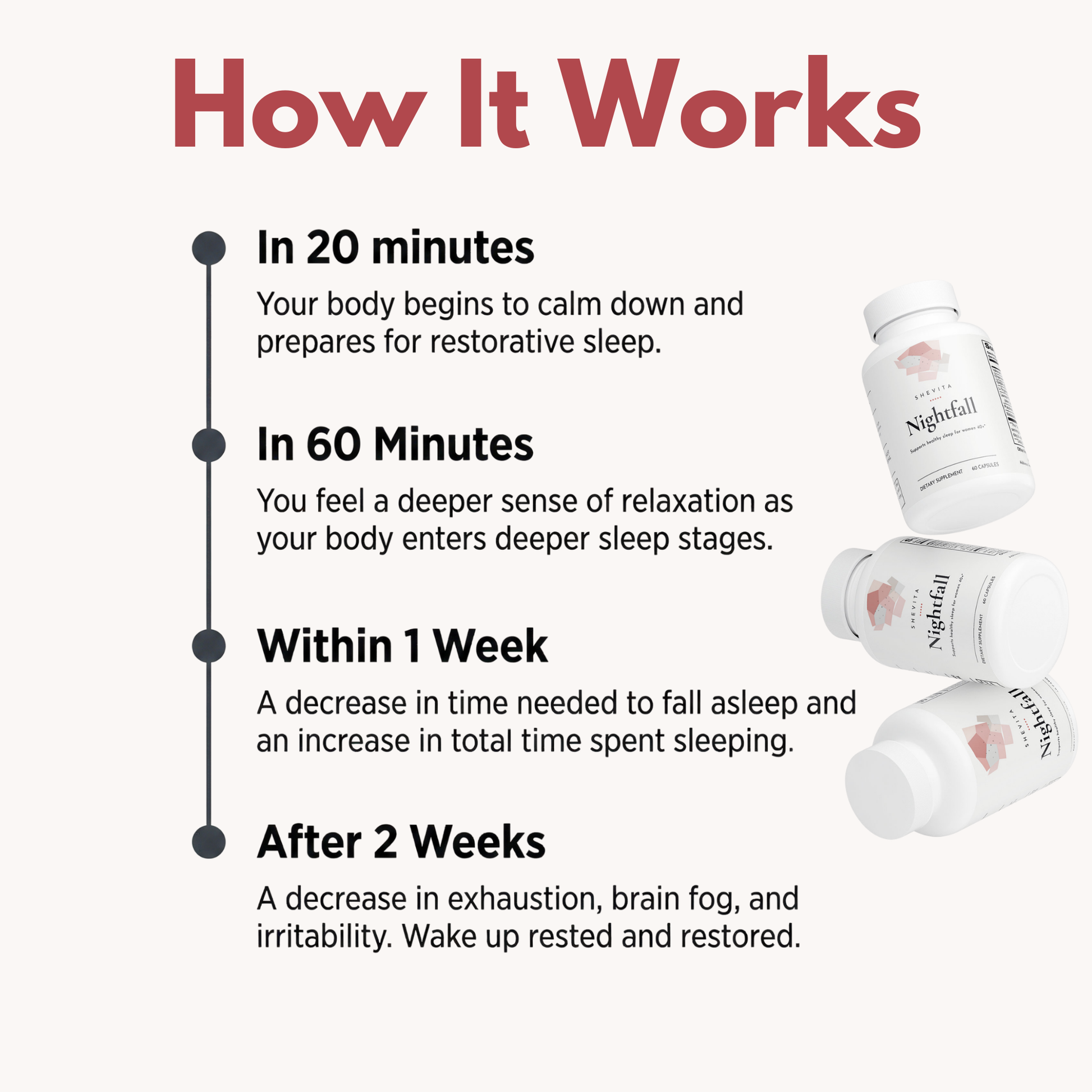 The best time of the day to take Nightfall is 60 minutes before you sleep.