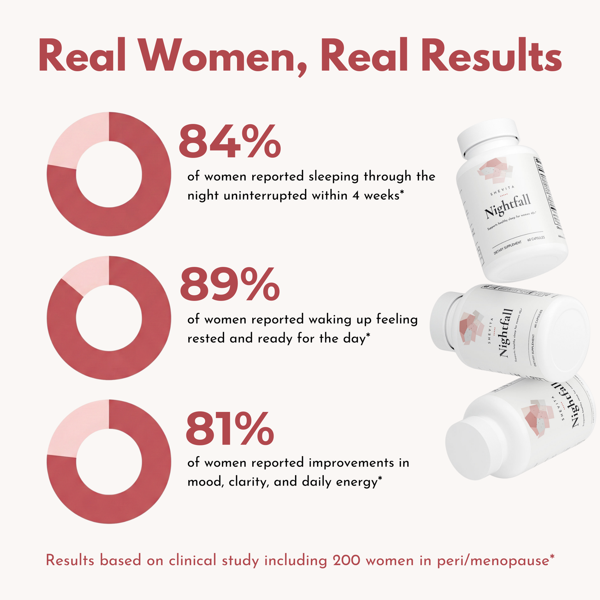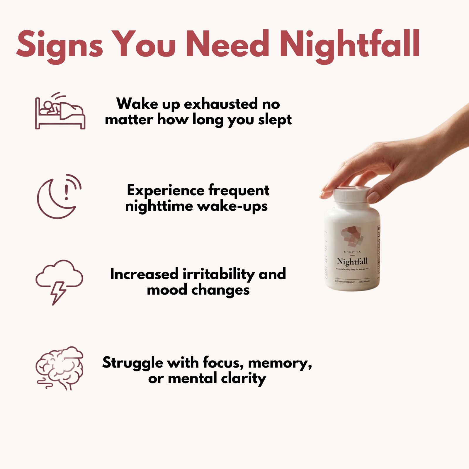 This isn't a general sleep supplement. Your sleep didn't break because of stress or screen time. It broke because peri/menopause disrupted the deep sleep your body depends on to restore itself. Nightfall is specifically formulated for that. For the 3am wake-ups. For the unrestorative sleep. For what perimenopause actually does.