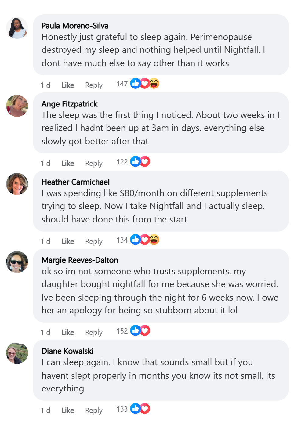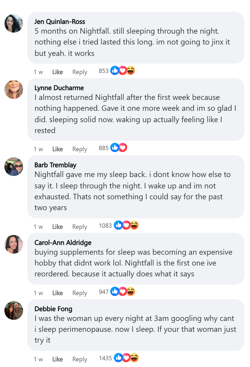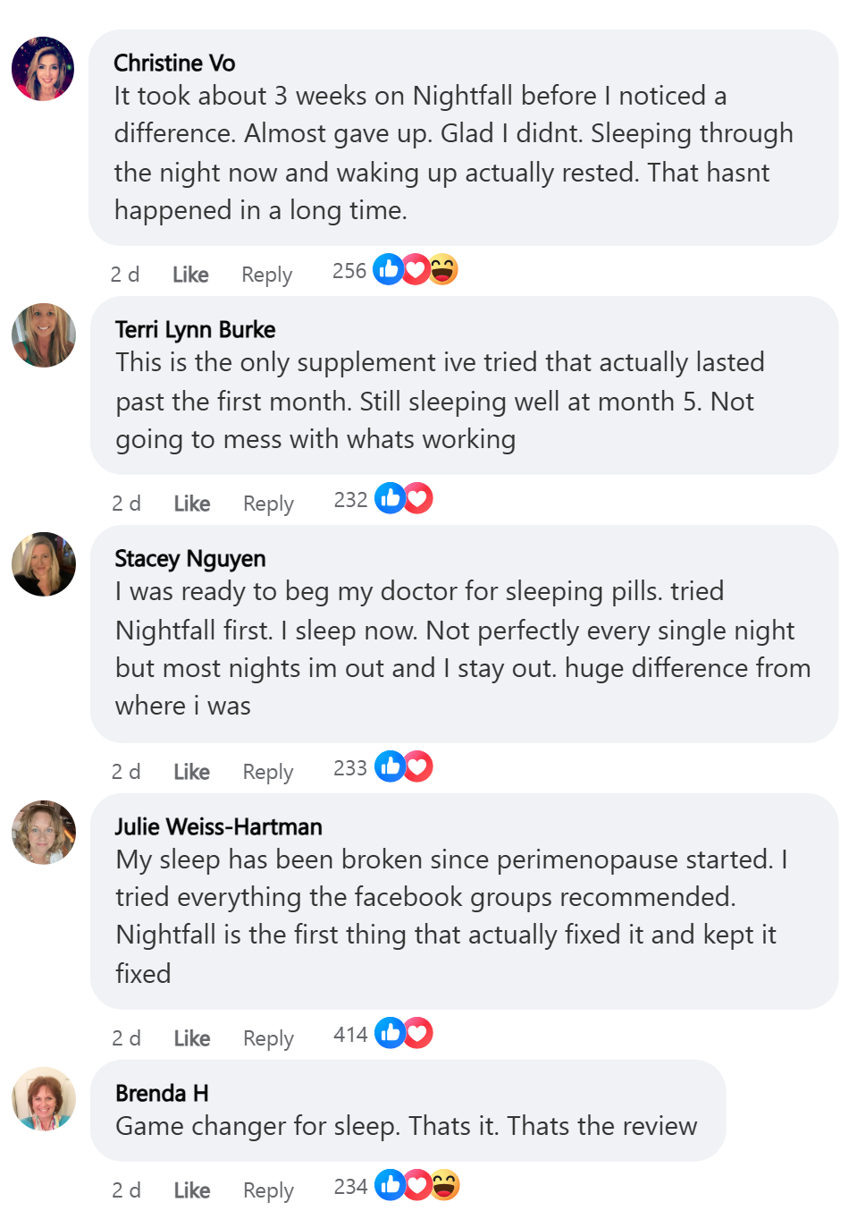 I've been taking Nightfall for eight months. I sleep through every night, my brain actually works and I'm not as easily irritated. I finally feel like me again.