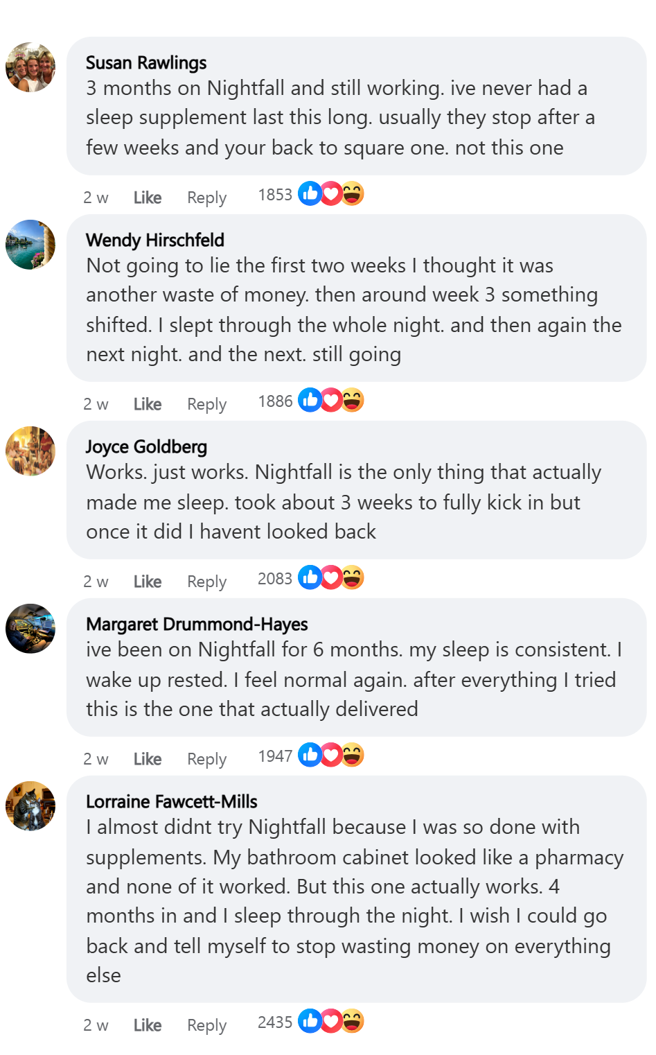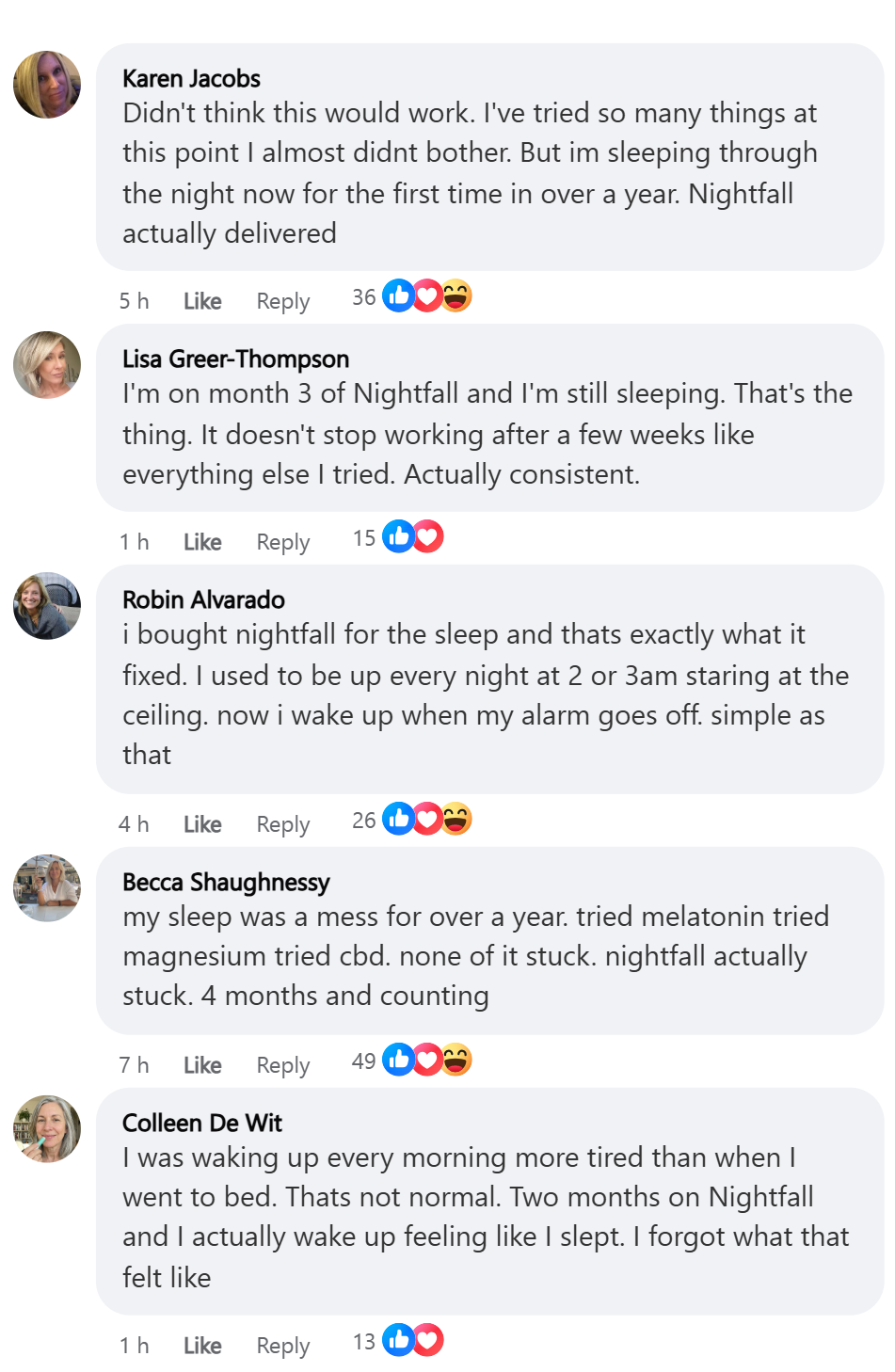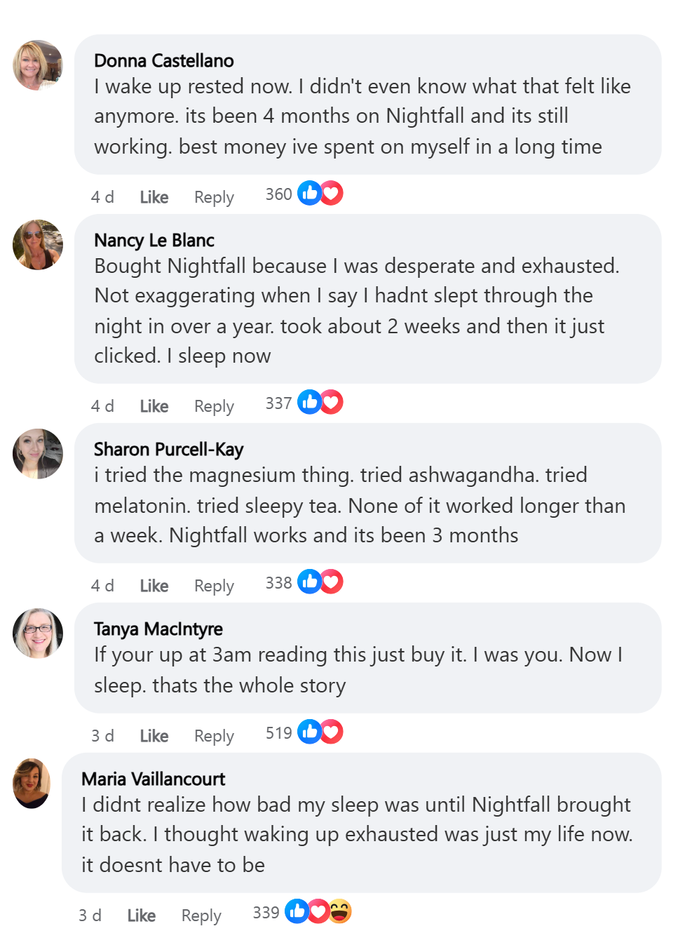 I've been taking Nightfall for eight months. I sleep through every night, my brain actually works and I'm not as easily irritated. I finally feel like me again.